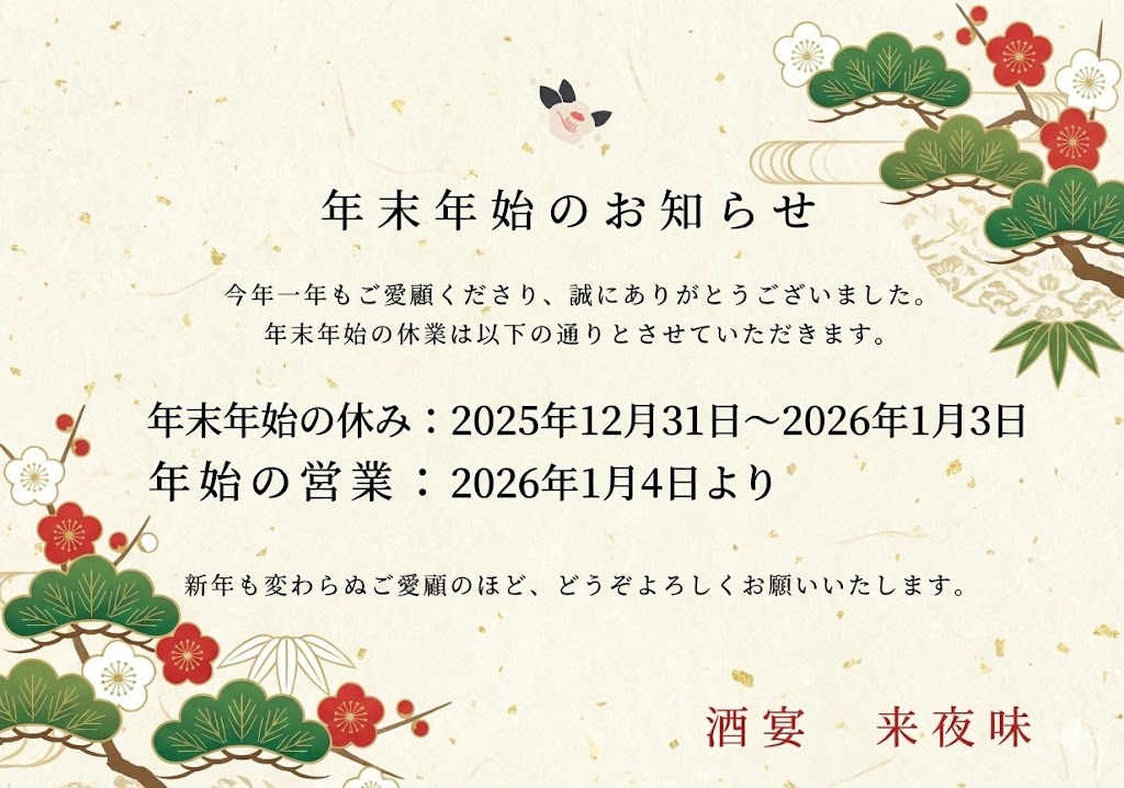2025年12月12日(金) お知らせ 年末年始の営業日のご案内 いつも来夜味をご愛顧いただき誠にありがとうございます。 年末の営業は12月30日までとなります。 年始の営業は1月4日より再開いたします。 皆様のご来店を心よりお待ちしております♪